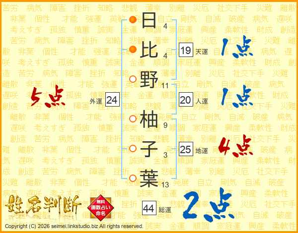 日(4画)比(4画)野(11画) 柚(9画)子(3画)葉(13画)