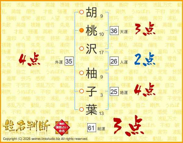 胡(9画)桃(10画)沢(17画) 柚(9画)子(3画)葉(13画)