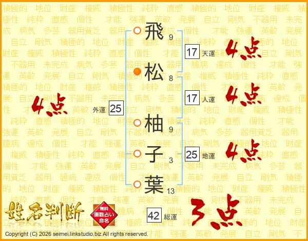 飛(9画)松(8画) 柚(9画)子(3画)葉(13画)