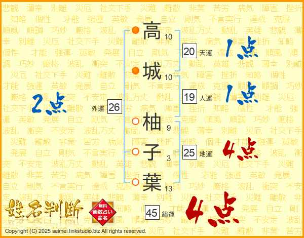 高(10画)城(10画) 柚(9画)子(3画)葉(13画)