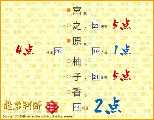 宮(10画)之(3画)原(10画) 柚(9画)子(3画)香(9画)