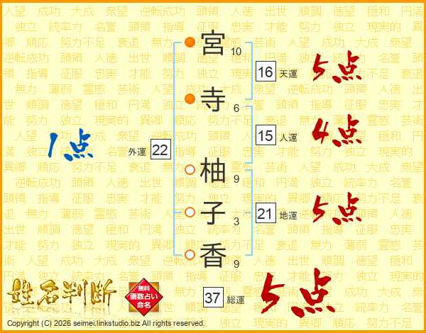 宮(10画)寺(6画) 柚(9画)子(3画)香(9画)