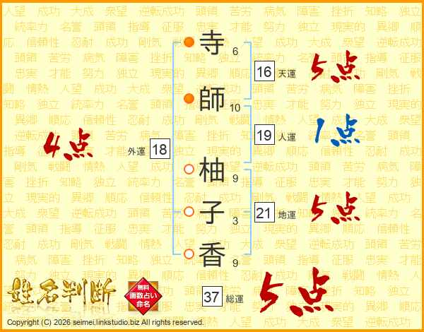 寺(6画)師(10画) 柚(9画)子(3画)香(9画)