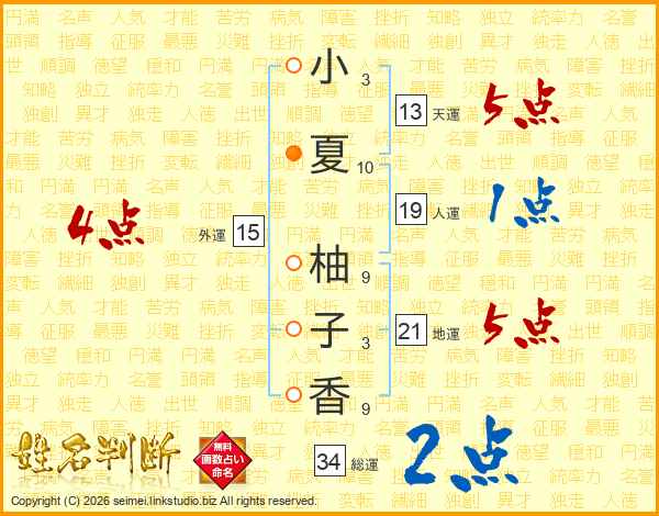 小(3画)夏(10画) 柚(9画)子(3画)香(9画)