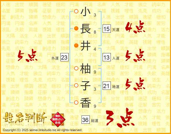 小(3画)長(8画)井(4画) 柚(9画)子(3画)香(9画)