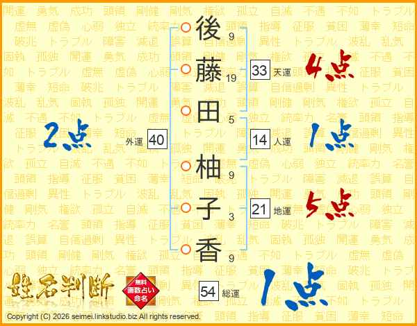後(9画)藤(19画)田(5画) 柚(9画)子(3画)香(9画)