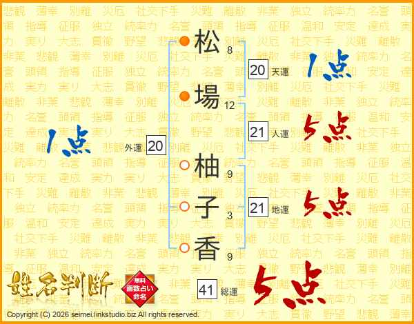 松(8画)場(12画) 柚(9画)子(3画)香(9画)