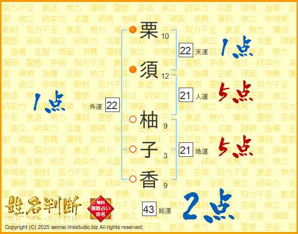栗(10画)須(12画) 柚(9画)子(3画)香(9画)