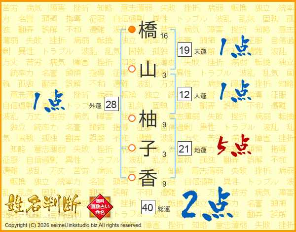 橋(16画)山(3画) 柚(9画)子(3画)香(9画)