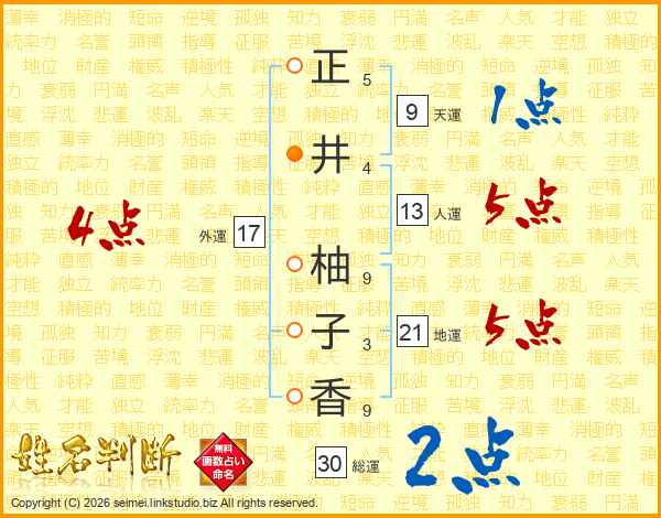 正(5画)井(4画) 柚(9画)子(3画)香(9画)