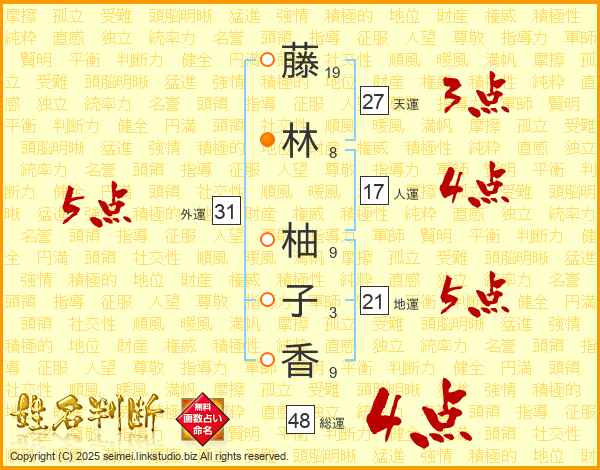 藤(19画)林(8画) 柚(9画)子(3画)香(9画)