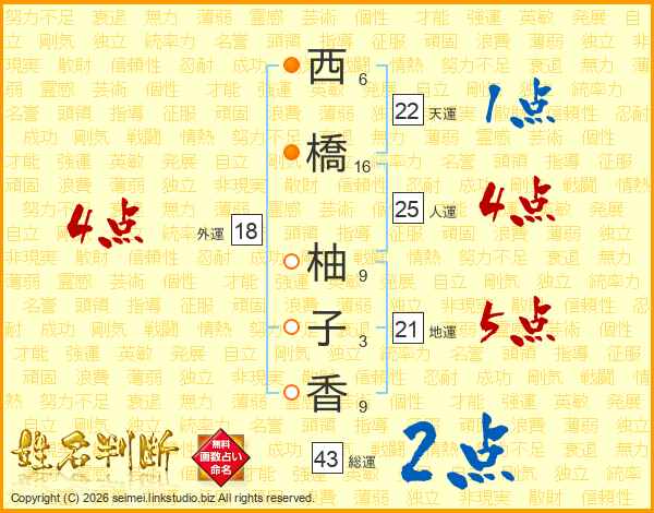 西(6画)橋(16画) 柚(9画)子(3画)香(9画)