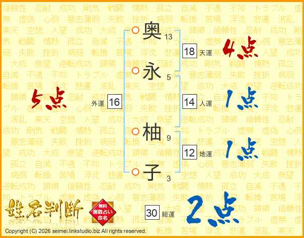 奥(13画)永(5画) 柚(9画)子(3画)