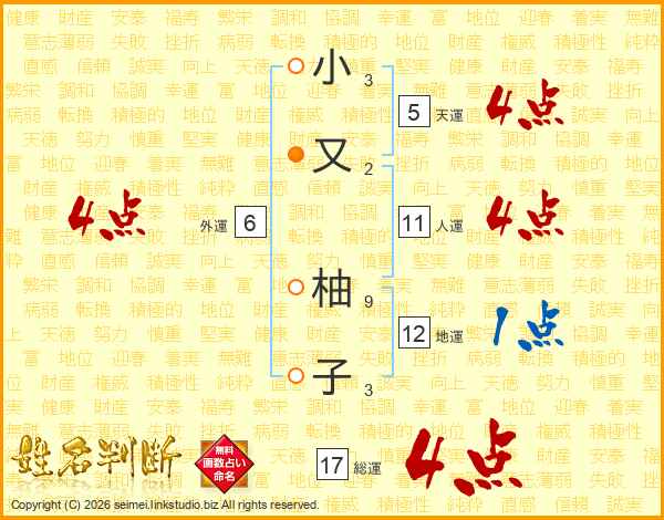 生活面を象徴する運勢です。外部から受ける影響力を表し、結婚運、家庭運や職場、環境への順応性を表します。総運から人運を引いた画数。姓や名が1文字の場合を除く。