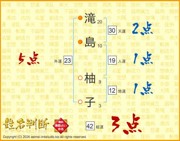 生活面を象徴する運勢です。外部から受ける影響力を表し、結婚運、家庭運や職場、環境への順応性を表します。総運から人運を引いた画数。姓や名が1文字の場合を除く。