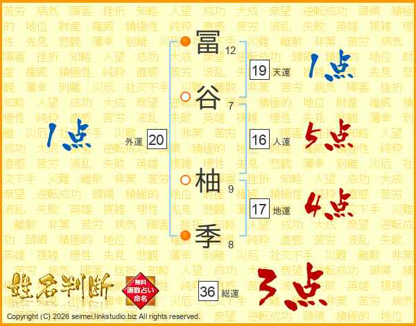 冨(12画)谷(7画) 柚(9画)季(8画)