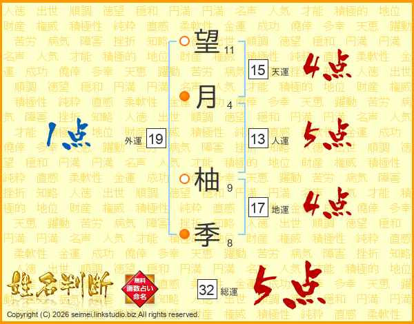 あなたの人生を表す1番重要な運勢です。生涯を通じて影響する総合運となり、主に50歳以降の晩年期に影響を及ぼします。苗字と名前の合計画数。