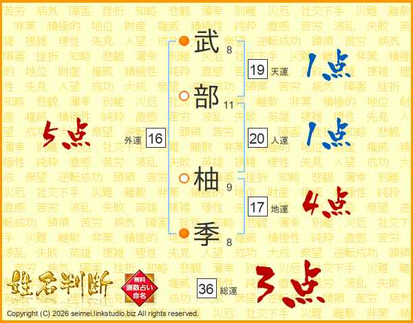 武(8画)部(11画) 柚(9画)季(8画)