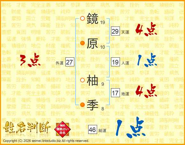 鏡(19画)原(10画) 柚(9画)季(8画)
