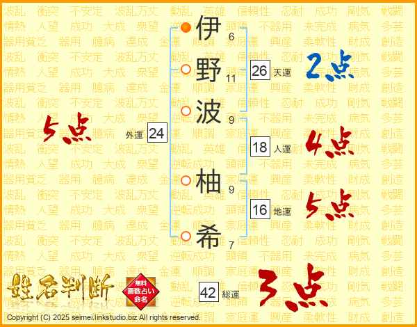 伊(6画)野(11画)波(9画) 柚(9画)希(7画)