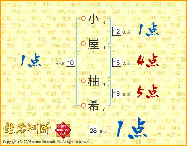 生活面を象徴する運勢です。外部から受ける影響力を表し、結婚運、家庭運や職場、環境への順応性を表します。総運から人運を引いた画数。姓や名が1文字の場合を除く。