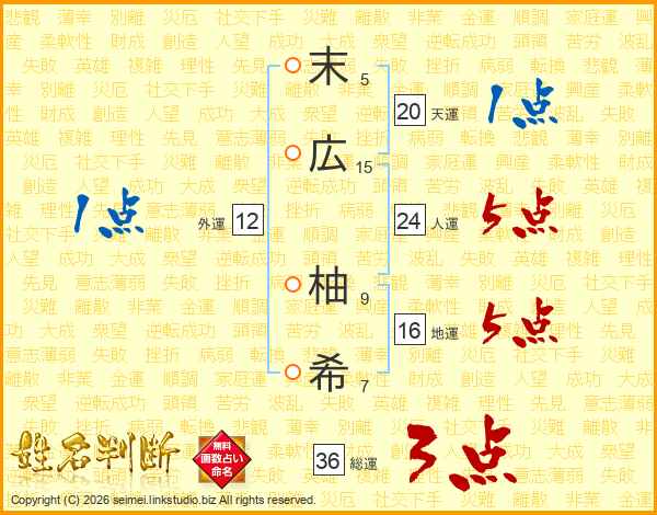 生活面を象徴する運勢です。外部から受ける影響力を表し、結婚運、家庭運や職場、環境への順応性を表します。総運から人運を引いた画数。姓や名が1文字の場合を除く。