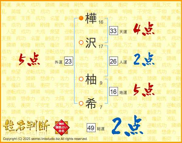 樺(16画)沢(17画) 柚(9画)希(7画)