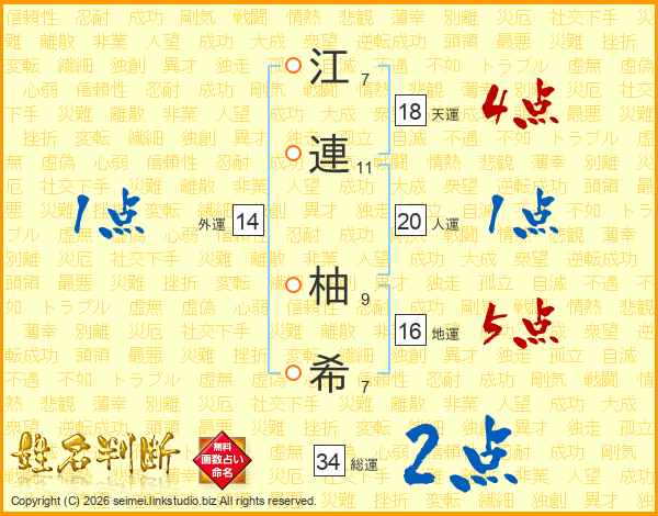 江(7画)連(11画) 柚(9画)希(7画)