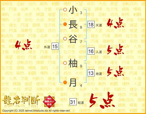 小(3画)長(8画)谷(7画) 柚(9画)月(4画)