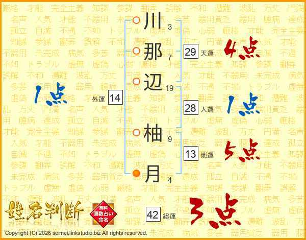 川(3画)那(7画)辺(19画) 柚(9画)月(4画)