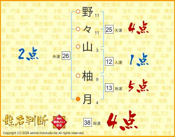 野(11画)々(11画)山(3画) 柚(9画)月(4画)