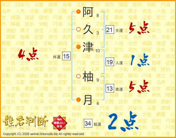 阿(8画)久(3画)津(10画) 柚(9画)月(4画)