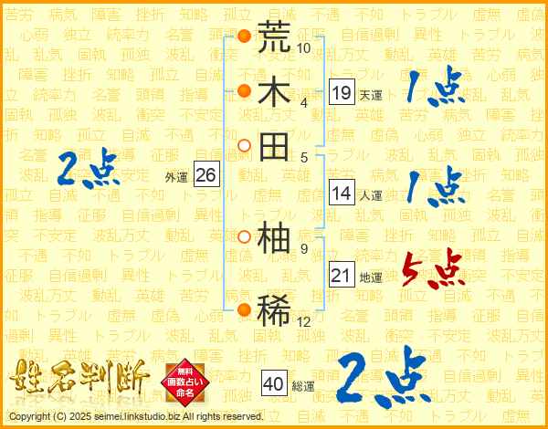 荒(10画)木(4画)田(5画) 柚(9画)稀(12画)