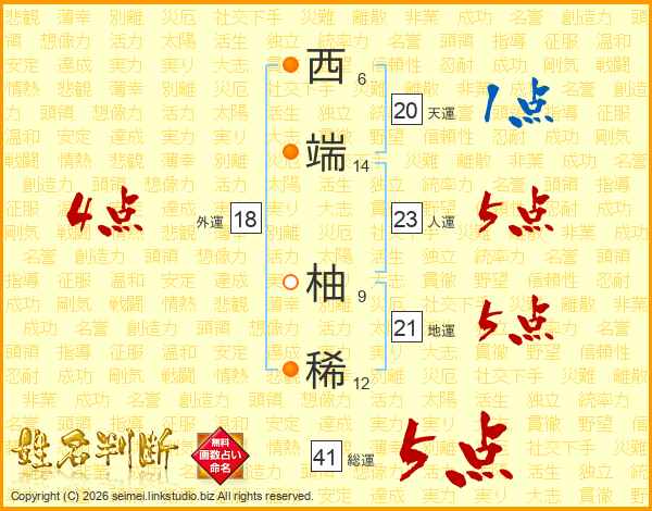 西端柚稀さんの総運は41画の5点!