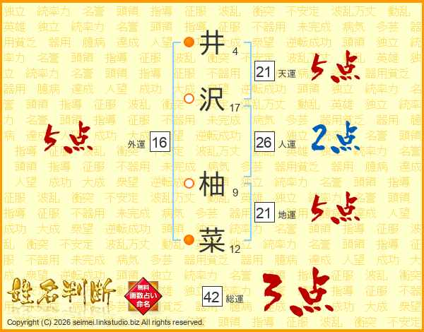 井(4画)沢(17画) 柚(9画)菜(12画)