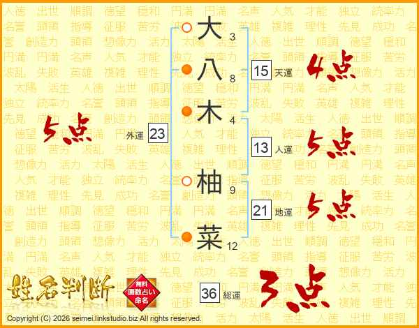 大(3画)八(8画)木(4画) 柚(9画)菜(12画)