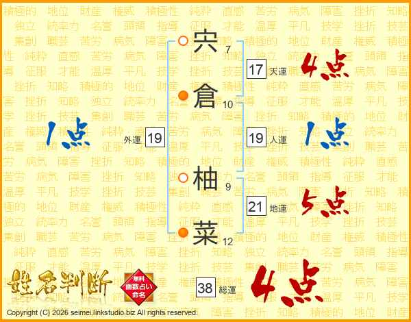 生活面を象徴する運勢です。外部から受ける影響力を表し、結婚運、家庭運や職場、環境への順応性を表します。総運から人運を引いた画数。姓や名が1文字の場合を除く。
