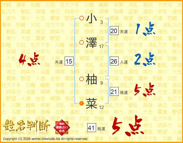 小(3画)澤(17画) 柚(9画)菜(12画)