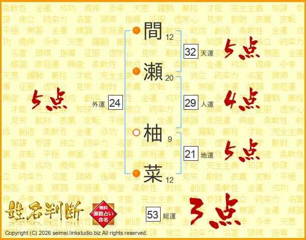 間瀬柚菜さんの総運は53画の3点!