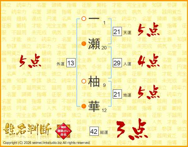 一(1画)瀬(20画) 柚(9画)華(12画)