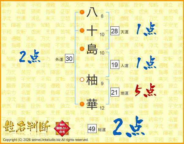 八(8画)十(10画)島(10画) 柚(9画)華(12画)