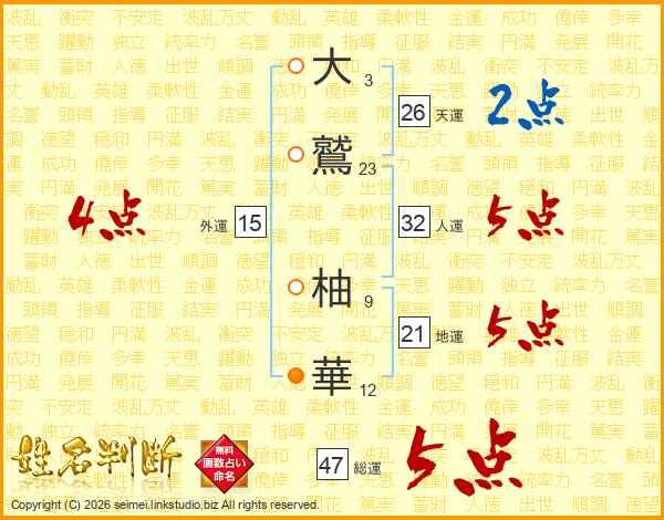 大(3画)鷲(23画) 柚(9画)華(12画)