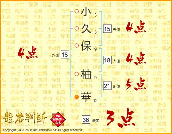 小(3画)久(3画)保(9画) 柚(9画)華(12画)