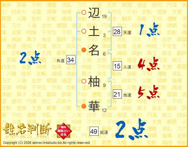 辺(19画)土(3画)名(6画) 柚(9画)華(12画)