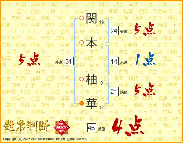 関(19画)本(5画) 柚(9画)華(12画)
