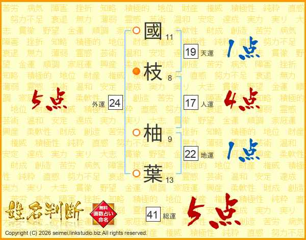 國(11画)枝(8画) 柚(9画)葉(13画)