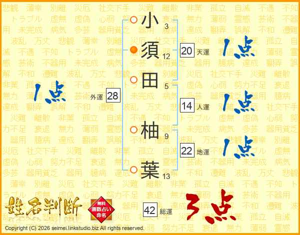 小(3画)須(12画)田(5画) 柚(9画)葉(13画)