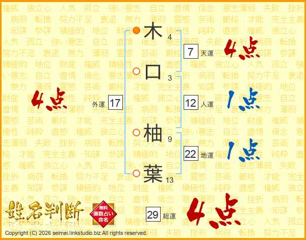 木(4画)口(3画) 柚(9画)葉(13画)