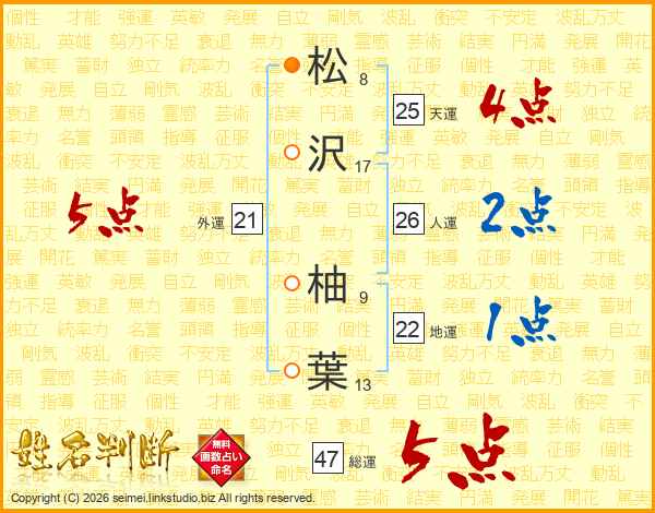 松(8画)沢(17画) 柚(9画)葉(13画)
