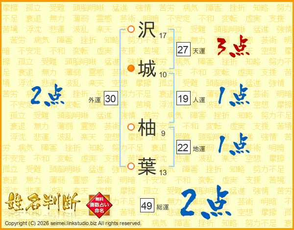 沢(17画)城(10画) 柚(9画)葉(13画)